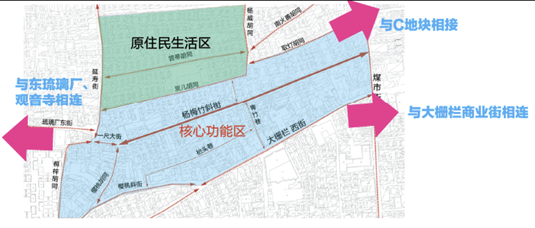 項(xiàng)目位于大柵欄地區(qū)煤市街以西,包括原住民生活區(qū)及楊梅竹核心功能區(qū);項(xiàng)目占地面積約8.8公頃,現(xiàn)狀1711戶,單位70個(gè),現(xiàn)狀建筑面積75920平方米,是實(shí)現(xiàn)大柵欄及東琉璃廠貫通的重要區(qū)域。
