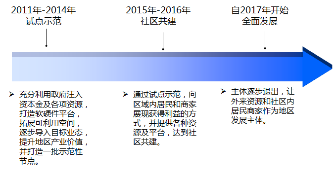 項(xiàng)目實(shí)施推進(jìn)的三個(gè)階段:從試點(diǎn)示范,帶動(dòng)社區(qū)共建,帶動(dòng)社會(huì)主體共同參與,最終實(shí)現(xiàn)區(qū)域全面發(fā)展。