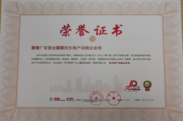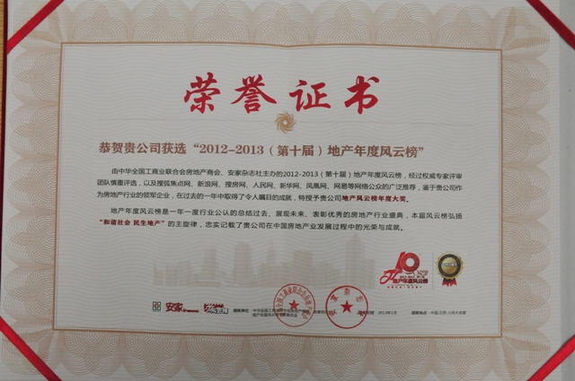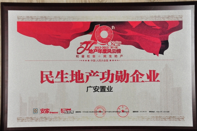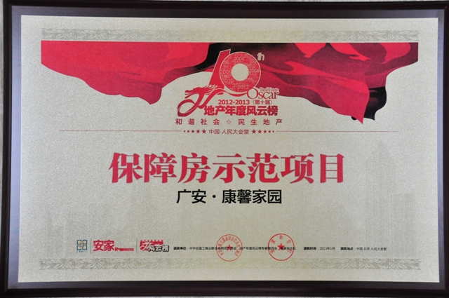 2013年1月18日,從全國工商聯(lián)房地產(chǎn)商會(huì)主辦的中國房地產(chǎn)業(yè)“2012-2013地產(chǎn)年度風(fēng)云榜”頒獎(jiǎng)盛會(huì)上傳來喜訊,北京廣安置業(yè)投資公司及廣安·康馨家園項(xiàng)目雙雙入選“2012-2013(第十屆)地產(chǎn)年度風(fēng)云榜”,置業(yè)公司喜獲2012-2013“民生地產(chǎn)功勛企業(yè)”、廣安·康馨家園項(xiàng)目獲得2012-2013“保障房示范項(xiàng)目”榮譽(yù)稱號(hào),這是置業(yè)公司在2012年度所獲得的又一大獎(jiǎng),也是對公司及全體員工一年來的辛勤工作的肯定和鼓舞。此次盛會(huì)已經(jīng)引起了國內(nèi)房地產(chǎn)行業(yè)眾多公司及知名行業(yè)人士的關(guān)注和參與,全國300多家媒體對此次盛會(huì)進(jìn)行了跟蹤報(bào)道。
